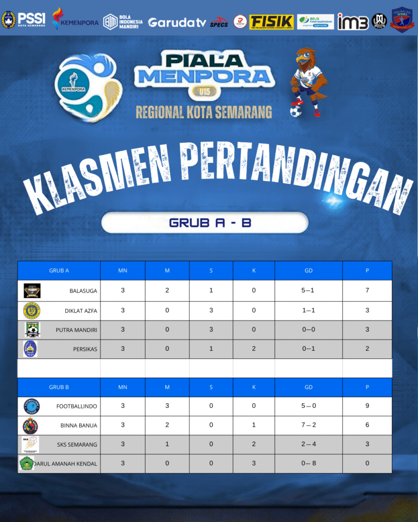 Klasemen Piala Menpora U-15 semakin memanas di Regional Kota Semarang. Kompetisi yang digelar hingga hari ketiga ini menampilkan semangat juang tinggi dari para pemain muda yang berasal dari berbagai daerah di Jawa Tengah. Setiap laga di turnamen ini menjadi ajang pembuktian kualitas pembinaan sepak bola usia dini yang semakin berkembang di tanah air.