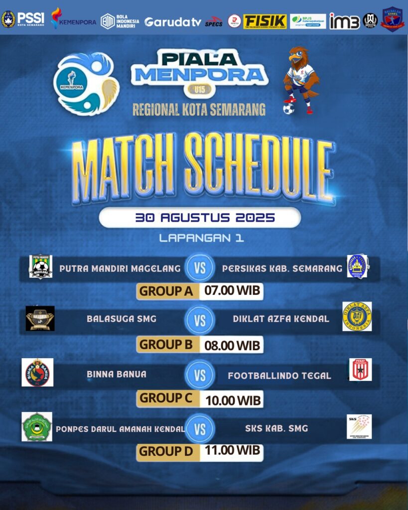 Semarang, 30 Agustus 2025 — Kemenpora, PSSI, dan Bola Indonesia Mandiri membuka secara resmi Piala Menpora U15 Regional Kota Semarang di Lapangan 1. Turnamen ini memberi kesempatan kepada pesepak bola muda untuk menunjukkan kemampuan terbaik mereka di level kompetitif.