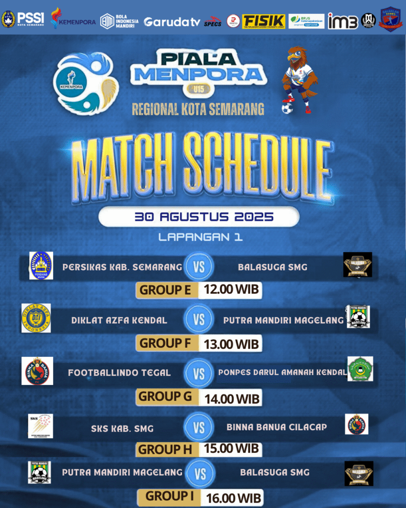 Turnamen Piala Menpora U15 Regional Kota Semarang 2025 menyiapkan generasi muda sepak bola Indonesia untuk berprestasi. Kemenpora, PSSI Kota Semarang, dan sponsor seperti Garuda TV, Specs, serta BPJS Ketenagakerjaan mendukung penuh kegiatan ini. Kompetisi ini melatih dan mempersiapkan bibit unggul yang siap mengharumkan nama bangsa. Untuk informasi resmi dan hasil pertandingan, kunjungi situs PSSI.